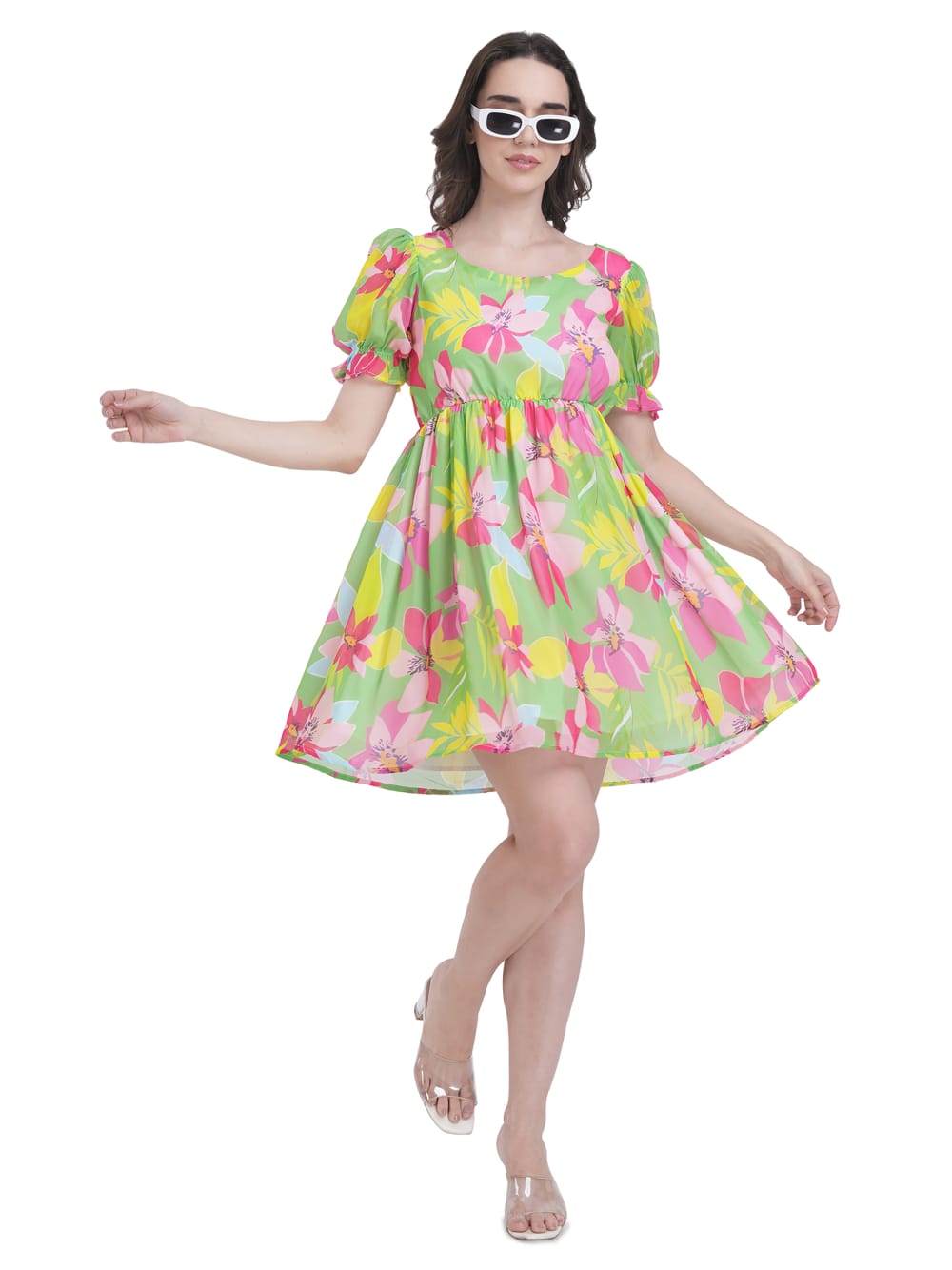 Step into sunshine vibes with our Tropical Bliss Short Dress, designed to bring freshness and fun to your summer wardrobe. Crafted in a lightweight fabric, this dress features a playful tropical floral print on a refreshing green base. The flattering empire waistline flows into an airy silhouette, while puff sleeves add a chic retro charm. Perfect for brunch dates, vacations, or casual day outings, this dress combines comfort with effortless style.